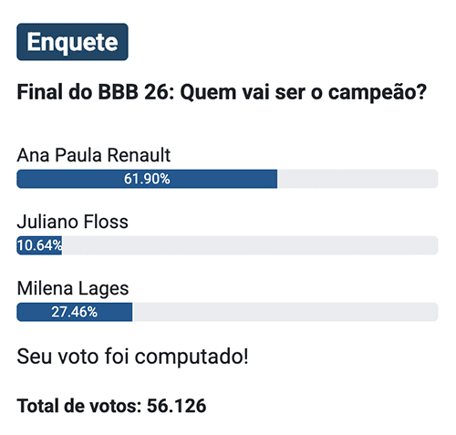 Já na enquete do Notícias da TV, que reúne 56.126 votos, ela registra 61,90%, contra 27,46% de Milena e 10,64% de Juliano.