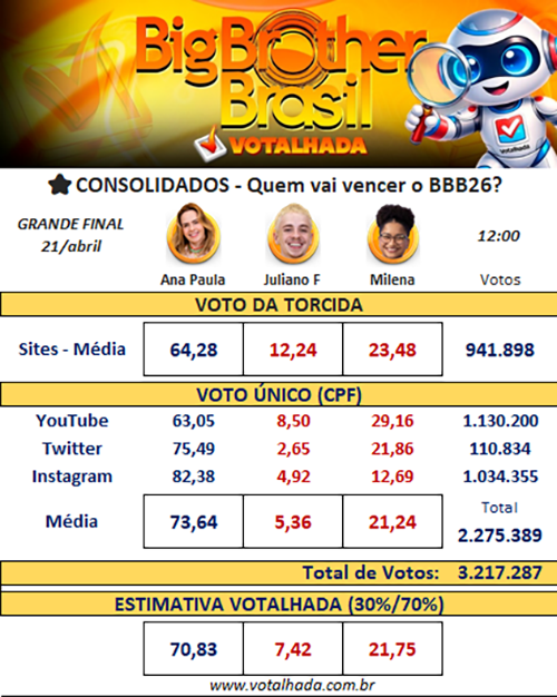 Na estimativa geral do Votalhada, baseada em 3.217.287 votos e alinhada aos critérios do programa, Ana Paula chega a 70,83%, ampliando a distância sobre Milena (21,75%) e Juliano (7,42%).