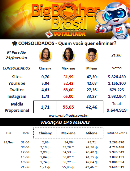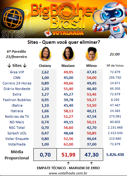 Já no levantamento do Votalhada, que reúne um compilado de 14 sites e totaliza impressionantes 5.826.430 votos, Maxiane segue na dianteira com 51,99%, contra 47,30% de Milena. Chaiany registra 0,70%.