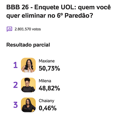 Na enquete do UOL, que já ultrapassa 2.801.570 votos, Maxiane aparece levemente à frente, com 50,73%, contra 48,82% de Milena. Chaiany soma apenas 0,46%, reforçando que a decisão está concentrada quase exclusivamente entre as duas sisters.