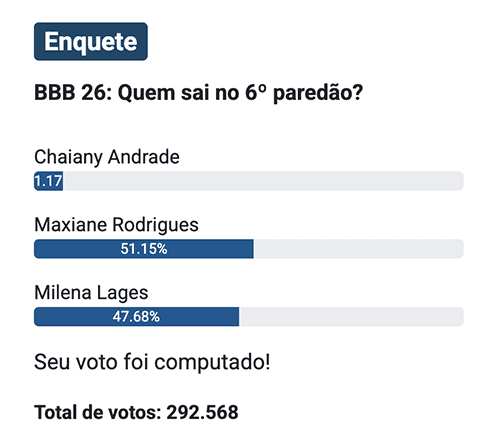 Cenário semelhante é visto na enquete do Notícias da TV, que contabiliza 292.568 votos. Por lá, Maxiane também lidera, com 51,15%, enquanto Milena tem 47,68%. Chaiany surge com 1,17%, mantendo distância considerável das adversárias.