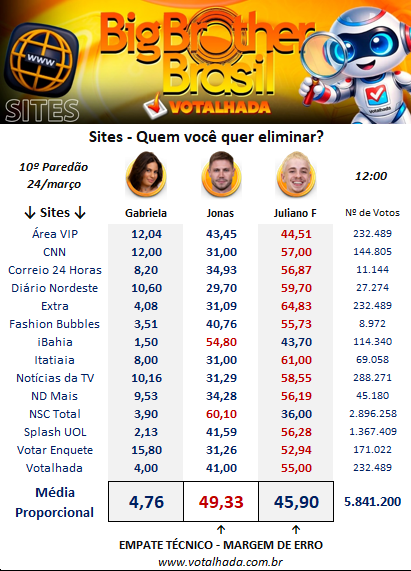 Já na estimativa geral do Votalhada, baseada nos critérios do programa e com mais de 12 milhões de votos, Jonas surgia novamente na frente, com 48,36%, contra 42,80% de Juliano e 8,98% de Gabriela.