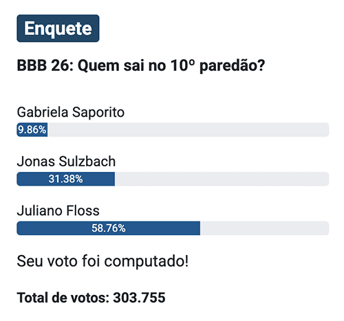 Por outro lado, o compilado do Votalhada, que reúne 12 sites e ultrapassava 5,8 milhões de votos, indicava um cenário diferente, com Jonas à frente, marcando 49,33%, enquanto Juliano aparecia com 45,90% e Gabriela com 4,76%.