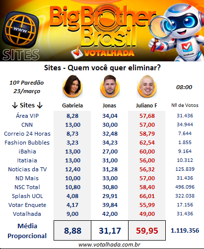 O compilado do Votalhada, que reúne 12 sites e ultrapassa 1,1 milhão de votos, também mantém Juliano à frente, com 59,95%, seguido por Jonas (31,17%) e Gabriela (8,88%).