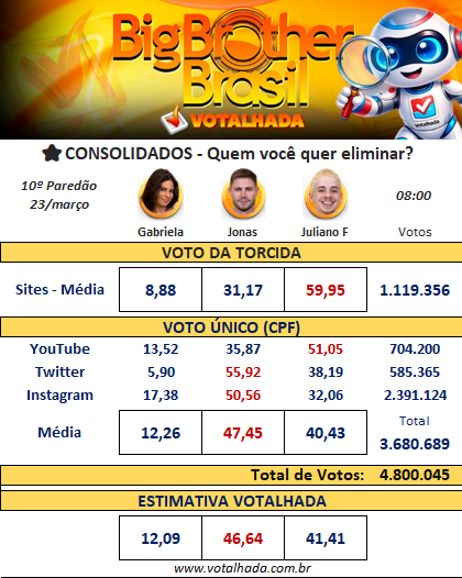 Na estimativa geral do Votalhada, que combina diferentes critérios e já soma mais de 4,8 milhões de votos, Jonas também aparece à frente, com 46,64%, enquanto Juliano tem 41,41% e Gabriela, 12,09%.