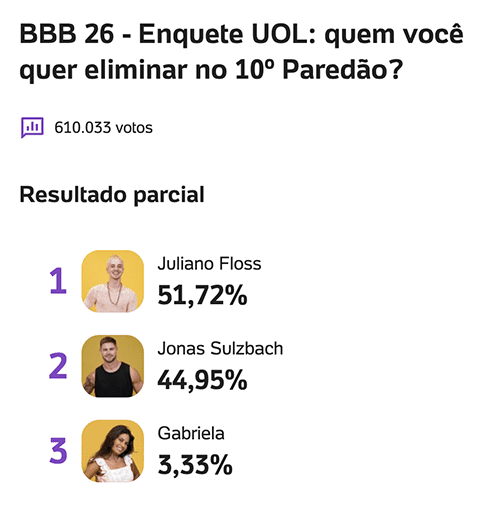 Na enquete do UOL, atualizada às 14h00 e com 610.033 votos, Juliano Floss segue na liderança, mas agora com vantagem bem menor: 51,72% contra 44,95% de Jonas. Gabriela aparece distante, com 3,33%.