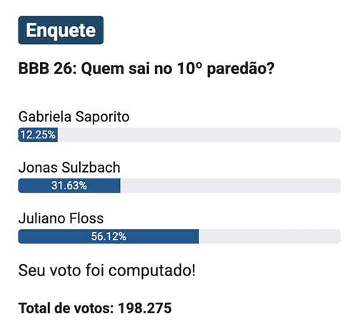 Já no levantamento do Notícias da TV, com 198.275 votos, o cenário é mais confortável para Juliano, que soma 56,12%, enquanto Jonas tem 31,63% e Gabriela registra 12,25%.