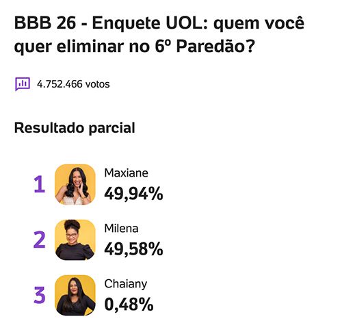 Na enquete do UOL, que já contabiliza 4.752.466 votos, Maxiane soma 49,94%, contra 49,58% de Milena, uma diferença mínima. Chaiany registra apenas 0,48%, reforçando sua posição confortável fora da zona de risco.