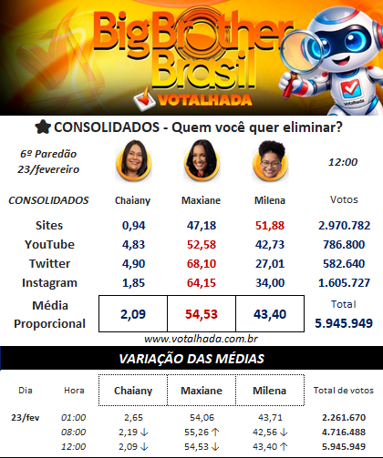 Já no Votalhada (23/02 – 14h15), que reúne um compilado de 14 sites e totaliza 2.970.782 votos, o cenário se inverte: Milena assume a dianteira, com 51,88%, contra 47,18% de Maxiane. Chaiany soma 0,94%.