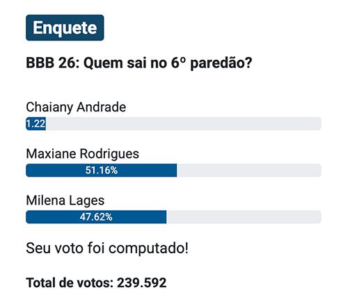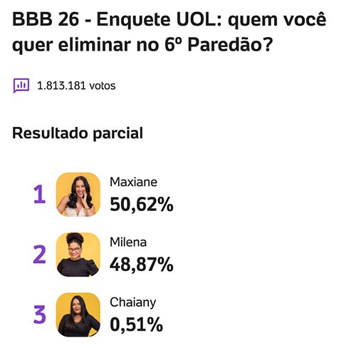 Resultado semelhante é visto na enquete do Notícias da TV (23/02 – 14h15), com 238.302 votos. Maxiane lidera com 51,14%, enquanto Milena registra 47,64%. Chaiany aparece com 1,22%.