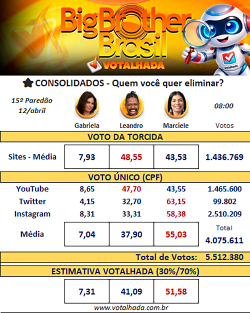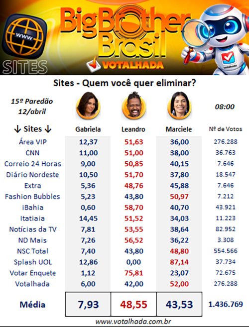 No compilado de 14 sites do Votalhada, com mais de 1,4 milhão de votos, Leandro também lidera, mas com vantagem menor: 48,55%, contra 43,53% de Marciele. Gabriela segue distante, com 7,93%.