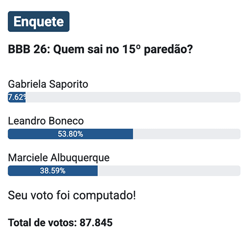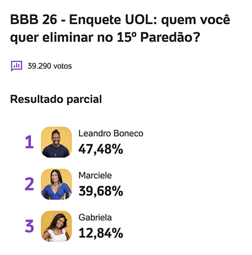 Na enquete do UOL, com 39.290 votos, Leandro aparece na liderança, com 47,48%, seguido por Marciele, com 39,68%, enquanto Gabriela soma 12,84%.