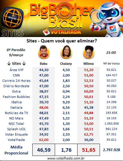 No levantamento do Votalhada, que reúne resultados de 14 sites, Milena registra 51,65% dos votos, contra 46,59% de Babu. Chaiany aparece com 1,76%, considerando 2.797.928 participações.