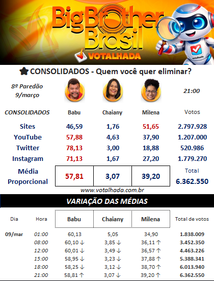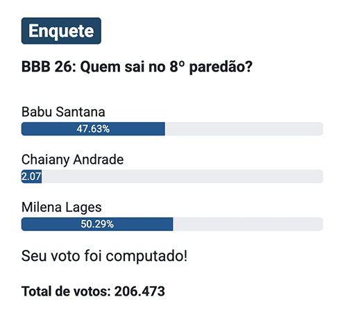 Já no compilado que reúne enquetes de sites e redes sociais, também divulgado pelo Votalhada, o cenário se inverte: Babu Santana lidera com 57,81% das intenções de voto, enquanto Milena soma 39,20%. Chaiany aparece com 3,07% em um total de 6.362.550 votos.