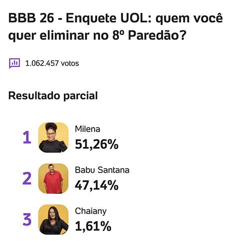 Na enquete do portal UOL, atualizada às 22h00, Milena aparece na liderança para deixar o reality com 51,26% dos votos. Babu Santana surge logo atrás, com 47,14%, enquanto Chaiany registra 1,61%. Ao todo, a votação reúne 1.062.457 participações.