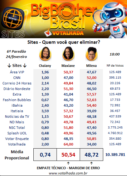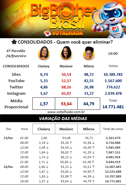 No Votalhada, que reúne dados de 14 sites e totaliza 10.389.781 votos, Maxiane surge levemente à frente, com 50,54%, contra 48,72% de Milena, e Chaiany com 0,74%.