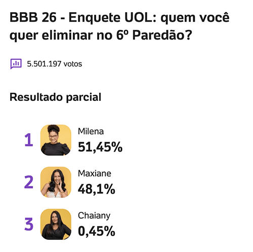Na enquete do UOL, que soma 5.501.197 votos, Milena aparece numericamente à frente, com 51,45%, contra 48,10% de Maxiane, enquanto Chaiany registra apenas 0,45%.