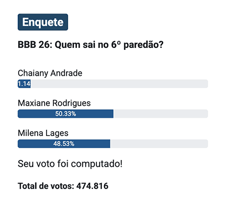 Já na Notícias da TV, com 474.816 votos, Maxiane lidera por margem mínima, com 50,33%, enquanto Milena aparece com 48,53% e Chaiany tem 1,14%.