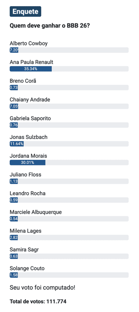 Na enquete, que já soma quase 112 mil votos, Ana Paula aparece na primeira posição, com cerca de 35% das preferências.