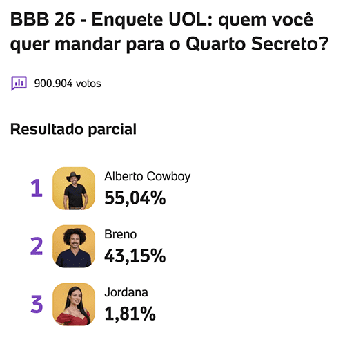 No UOL, com 900.904 votos registrados, Alberto Cowboy aparece com 55,04%, enquanto Breno soma 43,15%. Jordana tem 1,81%. O cenário mantém Cowboy em posição confortável, com diferença superior a 11 pontos percentuais.