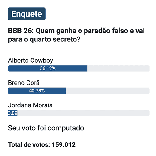 No Notícias da TV, que contabiliza 159.012 votos, Alberto amplia ligeiramente a margem: 56,12%, contra 40,78% de Breno. Jordana registra 3,09%. O resultado reforça a tendência de liderança consolidada de Cowboy nessa plataforma.