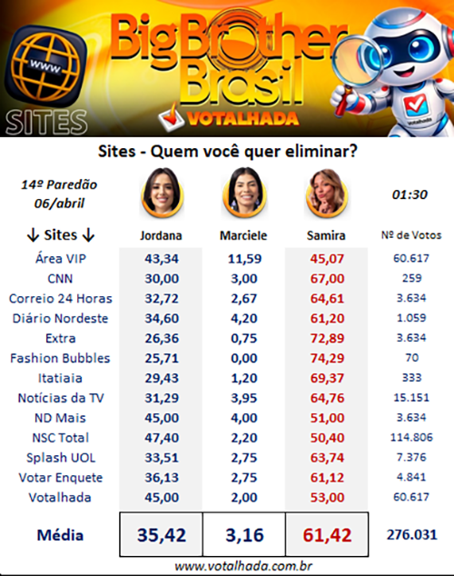 No compilado de 13 sites do Votalhada, com mais de 276 mil votos, Samira também lidera com 61,42%, seguida por Jordana, com 35,42%, e Marciele, com 3,16%.