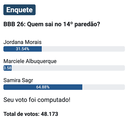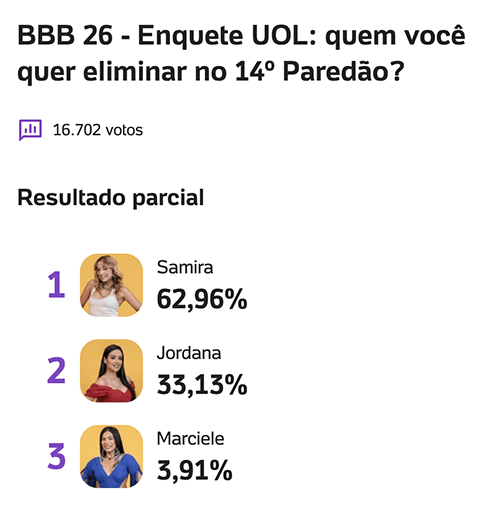Na enquete do UOL, com 16.702 votos, Samira aparece na liderança com 62,96%, enquanto Jordana soma 33,13% e Marciele tem 3,91%.