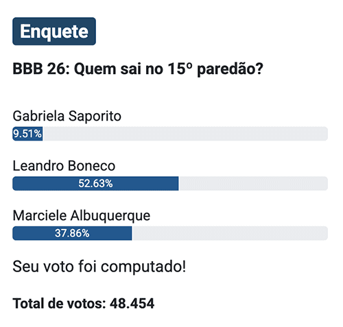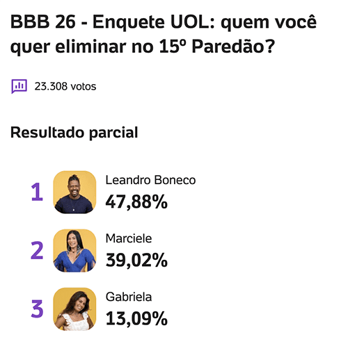 Na enquete do UOL, com 23.308 votos, Leandro aparece na liderança, com 47,88%, seguido por Marciele, com 39,02%, enquanto Gabriela soma 13,09%.