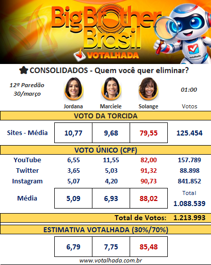 No compilado do Votalhada, que reúne 13 sites e mais de 125 mil votos, Solange também lidera com folga, com 79,55%. Na sequência aparecem Jordana, com 10,77%, e Marciele, com 9,68%.