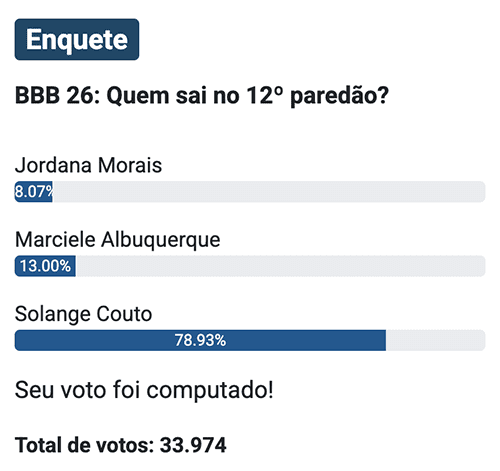 O levantamento do Notícias da TV, com 33.974 votos, segue a mesma linha: Solange registra 78,93%, contra 13,00% de Marciele e 8,07% de Jordana.