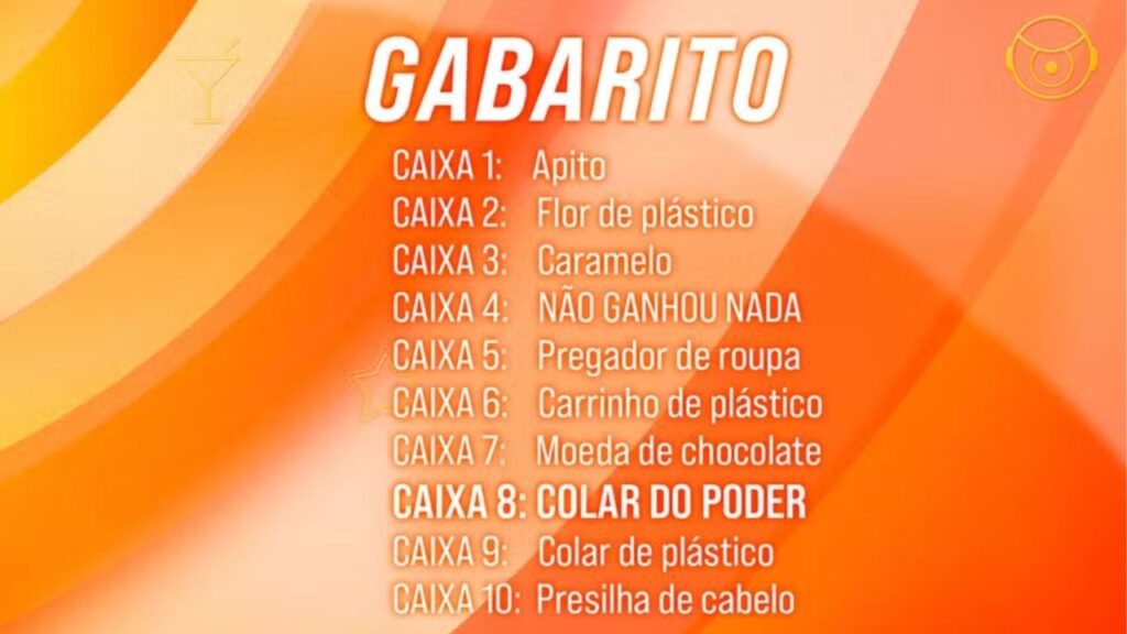 Dessa forma, o colar que dará o poder de salvar alguém do paredão está na caixa número 8.