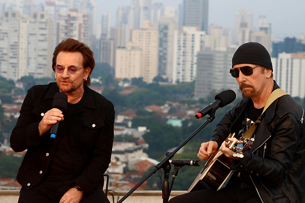 Bono Vox e os músicos da banda irlandesa U2 visitaram os estúdios da Globo, em São Paulo. Eles foram até o estúdio de vdiro e deram uma entrevista ao repórter Álvaro Pereira Junior e, em seguida, subiram ao heliponto do prédio da emissora para um pocket show exclusivo. Em visita ao Brasil para shows da turnê The Joshua Tree, os músicos cantaram Vertigo, grande sucesso do grupo. O evento, que vai ao ar no Fantástico do próximo domingo, 22/10, também irá contar com depoimentos de Bono e do baixista Adam Clayton sobre o fim da turnê, que comemora os 30 anos de lançamento do álbum que mudou a carreira da banda e sobre o novo disco.