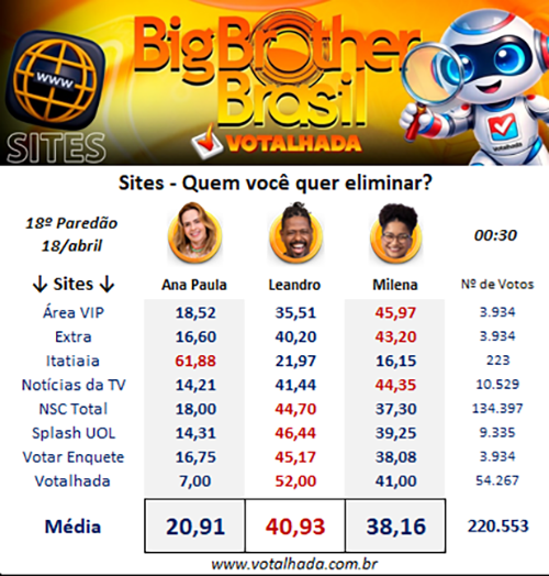 O compilado do Votalhada mostra diferentes recortes. Na média de 8 sites, com 220.553 votos, Leandro tem 40,93%, Milena aparece com 38,16% e Ana Paula com 20,91%.
