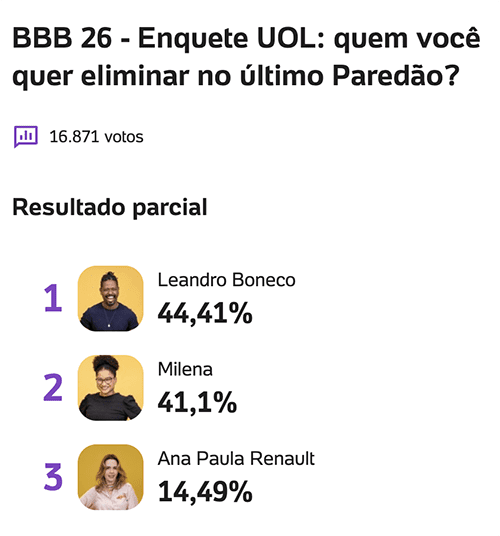 Na parcial do UOL, com 16.871 votos, Leandro aparece com 44,41%, seguido de perto por Milena, com 41,1%, enquanto Ana Paula soma 14,49%.