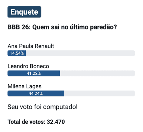Já na enquete do Notícias da TV, com 32.470 votos, o cenário se inverte: Milena lidera com 44,24%, contra 41,22% de Leandro e 14,54% de Ana Paula.