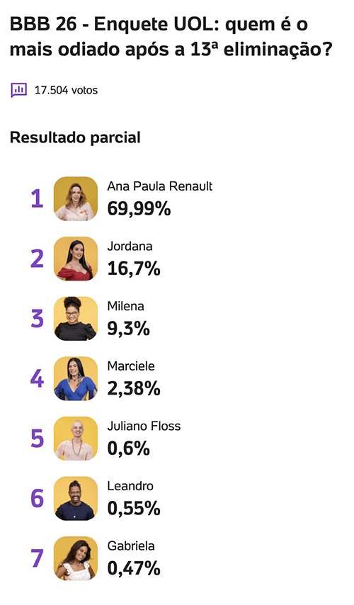 De acordo com o levantamento, Ana Paula Renault continua como a participante mais odiada pelo público, agora com 69,99% dos votos, ampliando ainda mais sua rejeição em relação à semana anterior, quando tinha 66,72%.