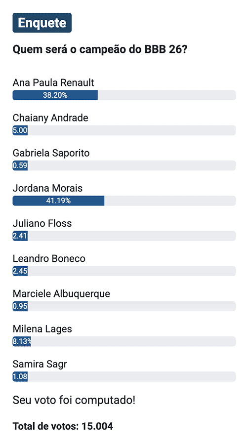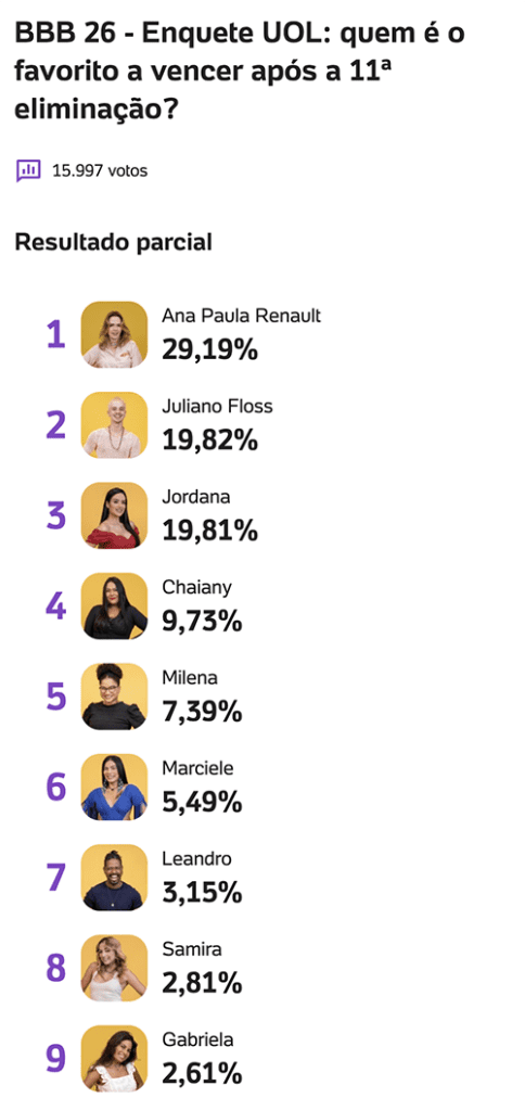 Na enquete do UOL, atualizada às 13h00 desta terça-feira (1º), Ana Paula Renault aparece na liderança, com 29,19%, seguida de perto por Juliano Floss (19,82%) e Jordana Morais (19,81%), indicando uma disputa aberta pelo topo.