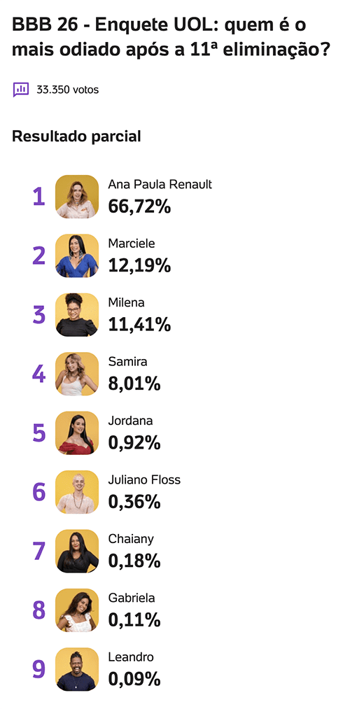 A enquete do UOL atualizada nesta quinta-feira (2), às 15h45, aponta uma mudança importante na percepção do público após a 11ª eliminação do BBB 26.