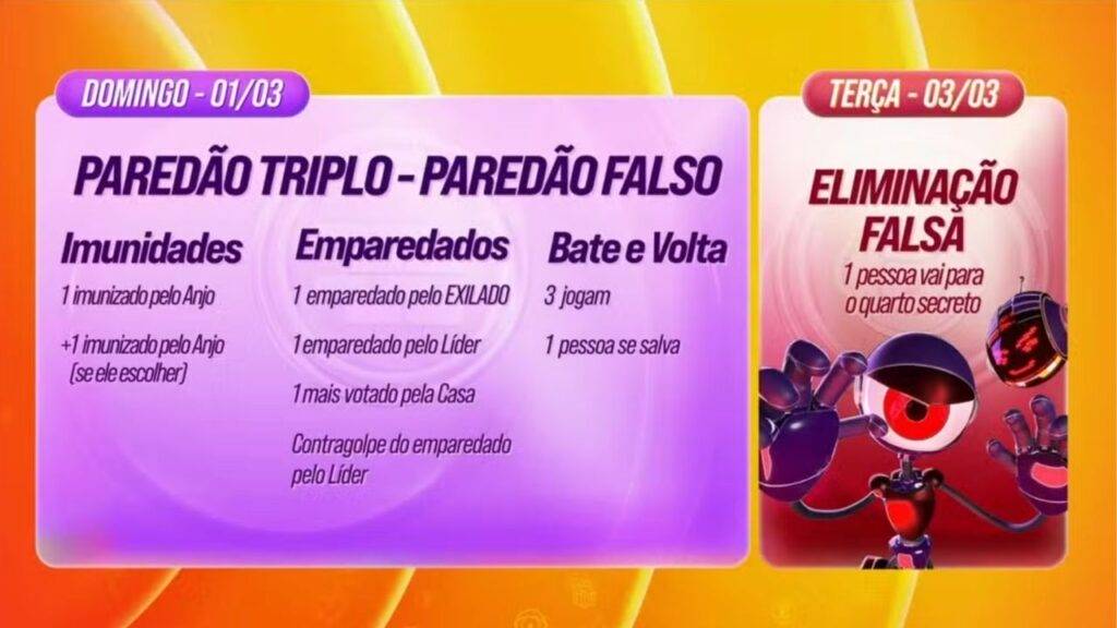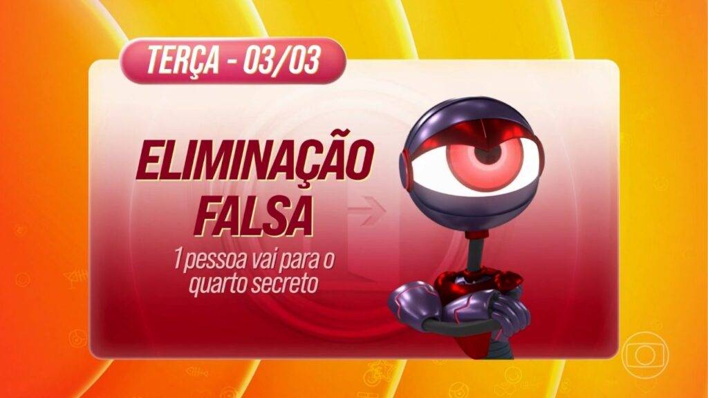 Na terça-feira (3), o programa fará uma falsa eliminação completa, com discurso, despedida e saída da casa. O escolhido seguirá para o Quarto Secreto, onde poderá observar tudo escondido, antes de retornar imune ao jogo.