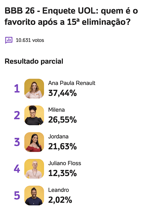 No levantamento do UOL, atualizado às 22h00 com 10.631 votos, Ana Paula lidera com 37,44%, seguida por Milena com 26,55% e Juliano com 12,35%. Leandro aparece mais atrás, com 2,02%. Jordana, que foi eliminada, tinha 21,59% e ocupava a terceira posição, votos que agora tendem a se redistribuir.