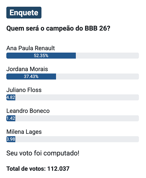 Já na enquete do Notícias da TV, com 112.037 votos, a vantagem de Ana Paula é ainda mais expressiva: ela soma 52,35%, enquanto Juliano tem 4,82%, Milena aparece com 3,98% e Leandro Boneco registra 1,42%. Jordana, que estava em segundo lugar com 37,43%, também sai da disputa, o que pode impactar diretamente os próximos resultados.