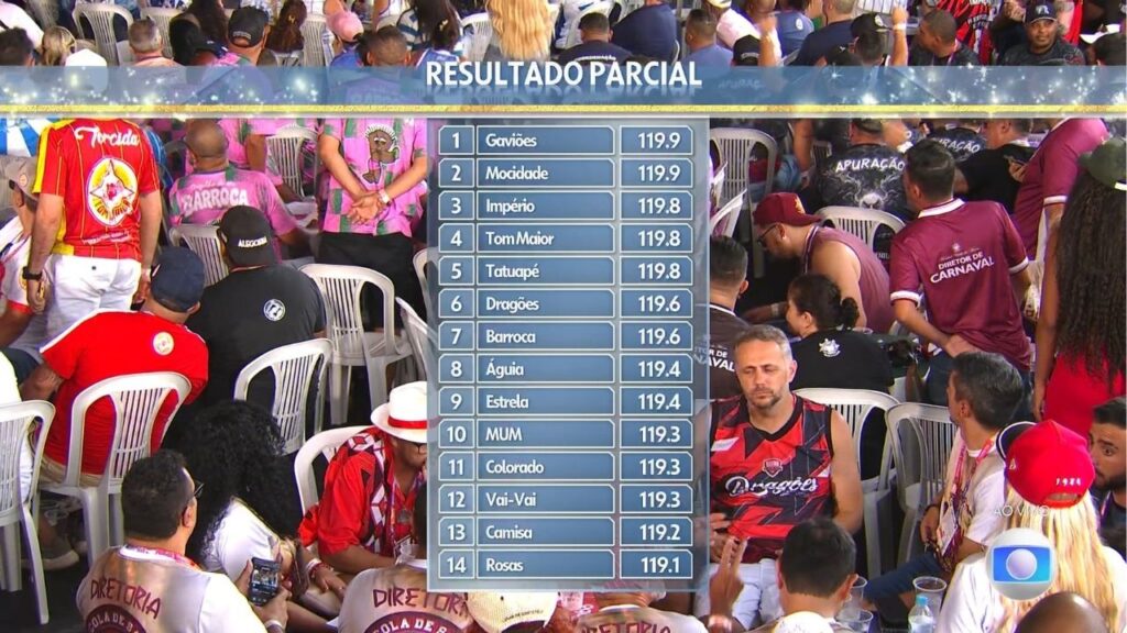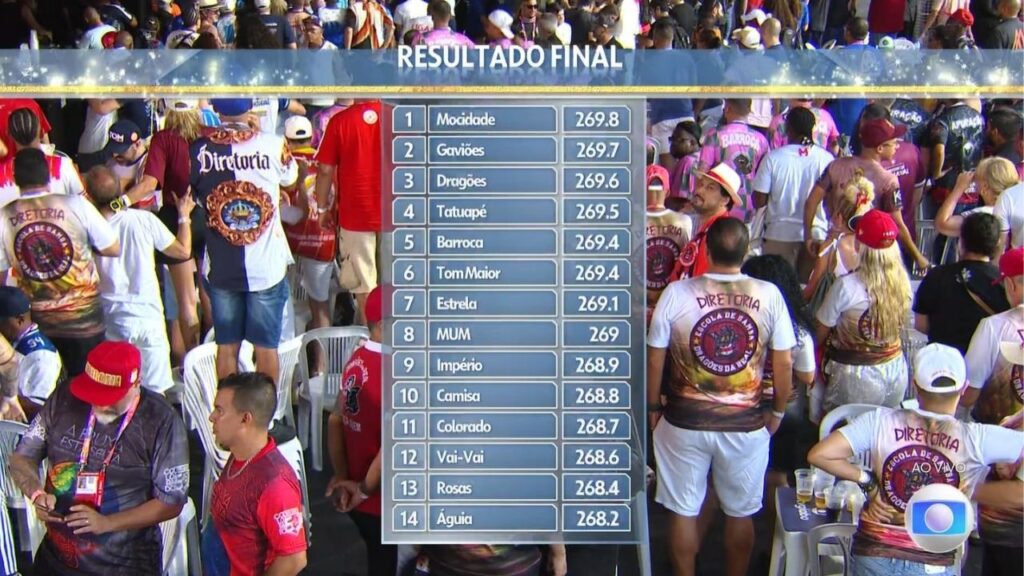 A definição da campeã ocorre após a leitura do último quesito, quando é consolidada a pontuação final de cada escola.