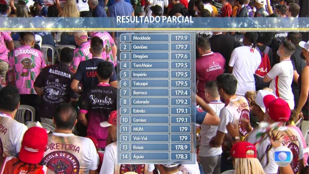 Após o sexto quesito, Alegoria (imagem acima), a Mocidade segue isolada na ponta, com 179,9 pontos, seguida pela Gaviões, com 179,7 pontos, Dragões, com 179,6 pontos, Tom Maior, Império e Tatuapé, com 179,5 pontos, Barroca, com 179,4 pontos, Colorado, com 179,2 pontos, Estrela e Camisa, com 179,1 pontos, Mocidade Unida da Mooca e Vai-Vai, com 179 pontos, Rosas de Ouro, com 178,9 pontos, e Águia de Ouro, com 178,3 pontos.