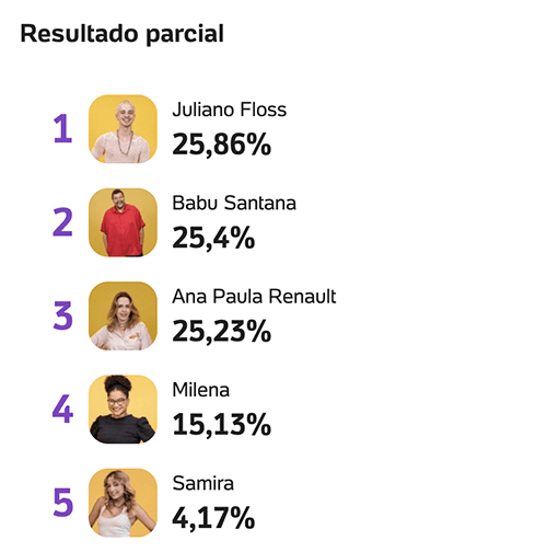 Juliano Floss aparece na primeira posição com 25,86% dos votos, seguido de perto por Babu Santana, com 25,4%, e Ana Paula Renault, com 25,23%. Os três nomes formam um verdadeiro empate técnico na preferência dos votantes.