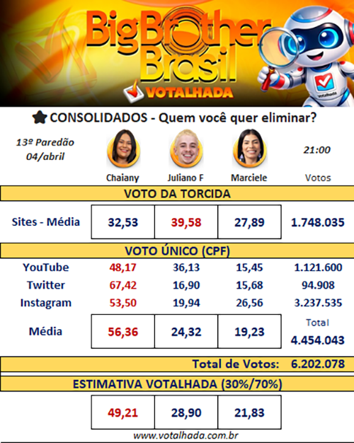Esse movimento se reflete também na estimativa geral do Votalhada, que tenta simular o modelo oficial do programa: Chaiany lidera com 49,21%, contra 28,90% de Juliano e 21,83% de Marciele.
