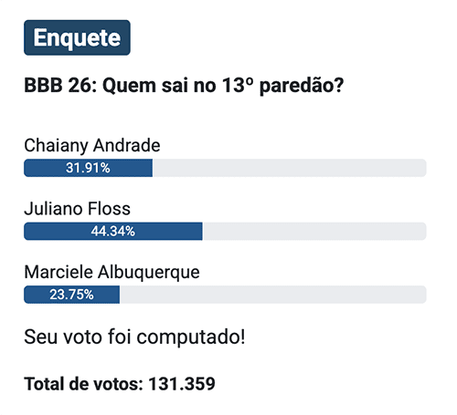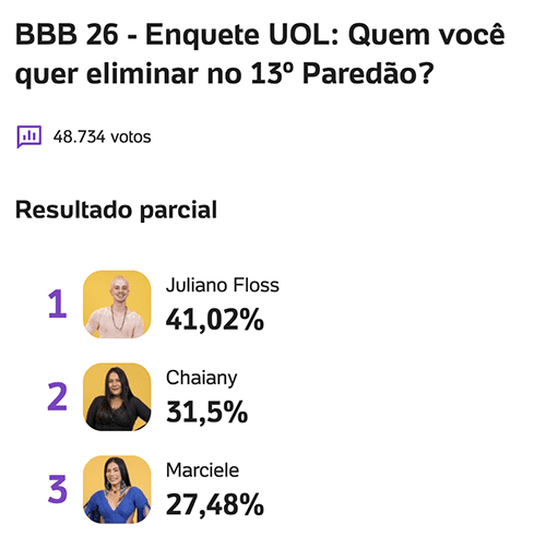 Nas enquetes tradicionais, Juliano Floss segue na liderança. No UOL, com 48.734 votos, ele aparece com 41,02%, enquanto Chaiany tem 31,5% e Marciele soma 27,48%.