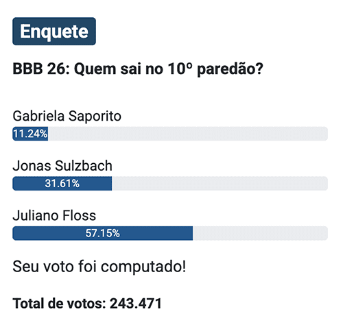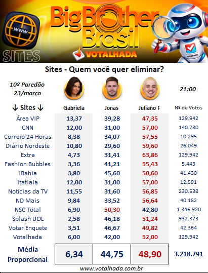 Já no compilado do Votalhada, que reúne 12 sites e ultrapassa 3,2 milhões de votos, a diferença é bem menor: Juliano tem 48,90% e Jonas aparece próximo, com 44,75%, enquanto Gabriela registra 6,34%.