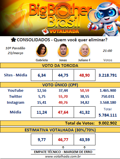 A estimativa geral do Votalhada, baseada no critério do programa e somando mais de 9 milhões de votos, também aponta Jonas à frente, com 46,77%, contra 43,59% de Juliano e 9,77% de Gabriela.