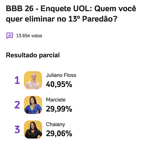 No UOL, com 13.654 votos, Juliano Floss segue na liderança, agora com 40,95%, enquanto Marciele aparece com 29,99% e Chaiany logo atrás, com 29,06%.