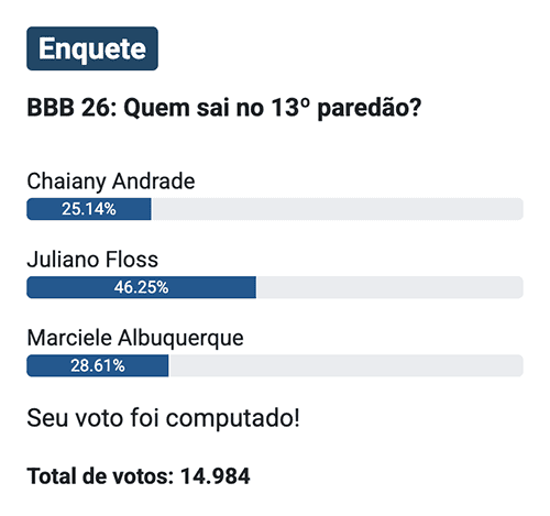 Já no levantamento do Notícias da TV, que soma 14.984 votos, Juliano amplia a vantagem e chega a 46,25%, contra 28,61% de Marciele e 25,14% de Chaiany.